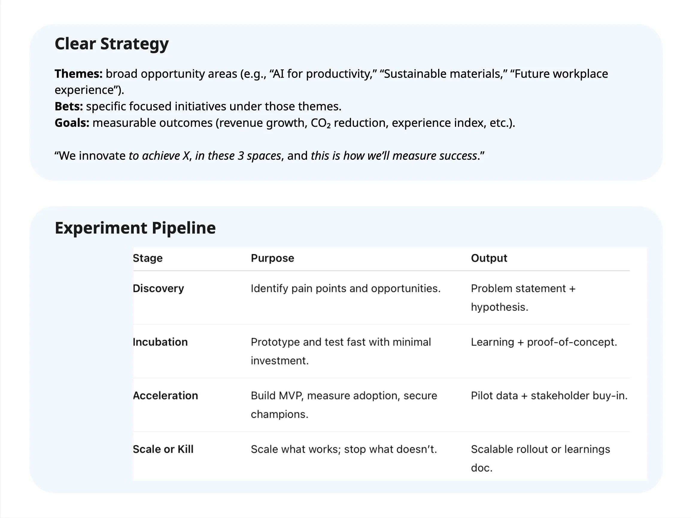Experiment Pipelines : Move ideas through stages: discovery, incubation, acceleration, and scale or stop. Learn fast before you scale.