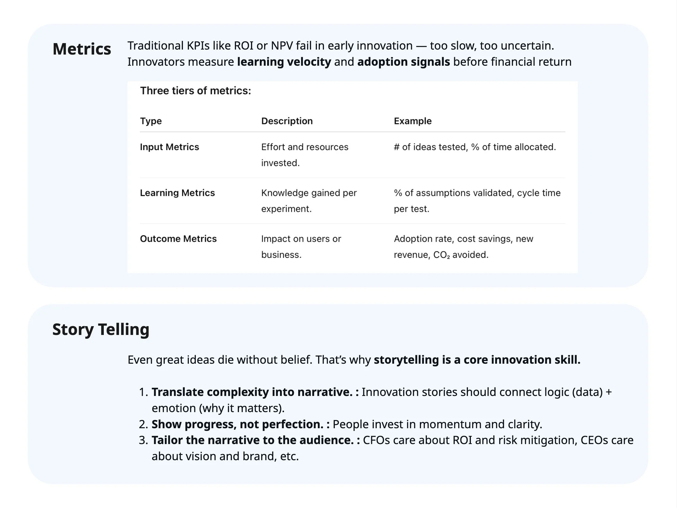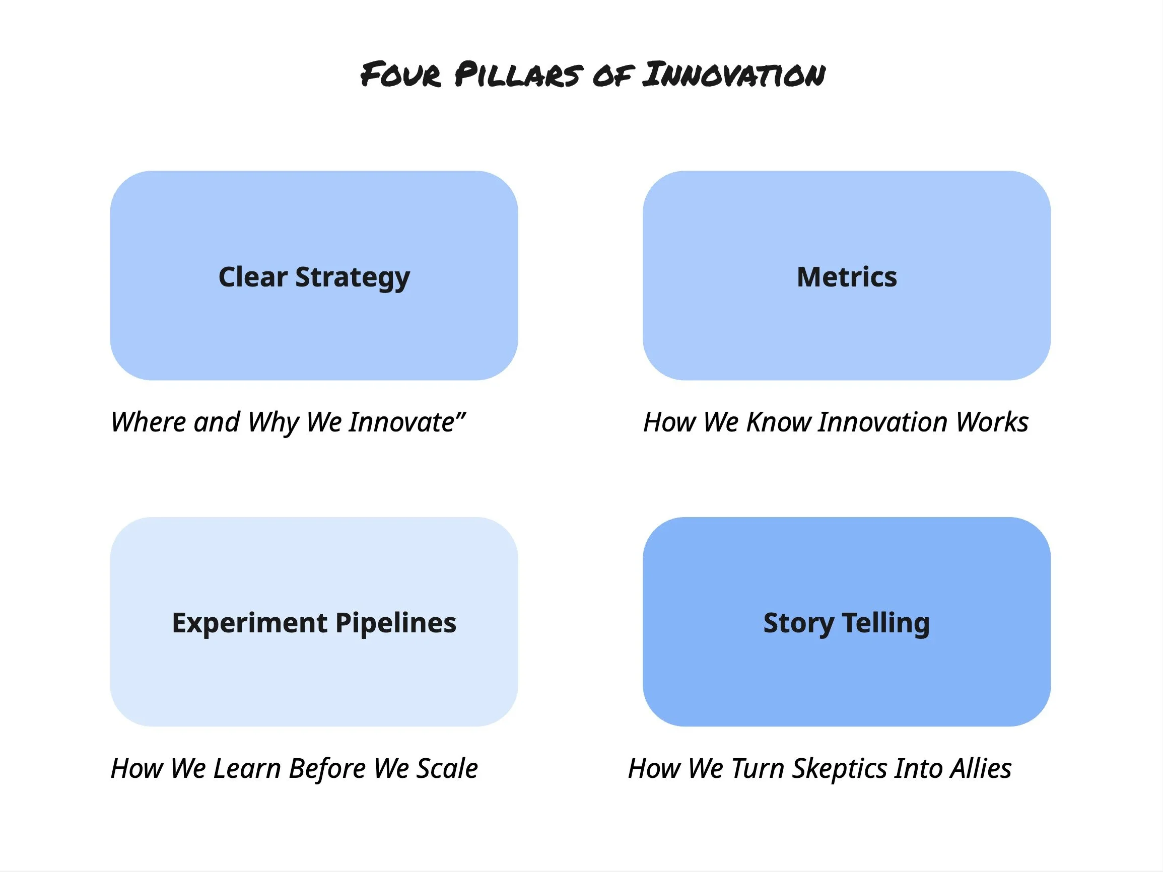 Behind every successful innovation effort, there are four foundations that keep the rhythm steady: strategy, pipelines, metrics, and storytelling.