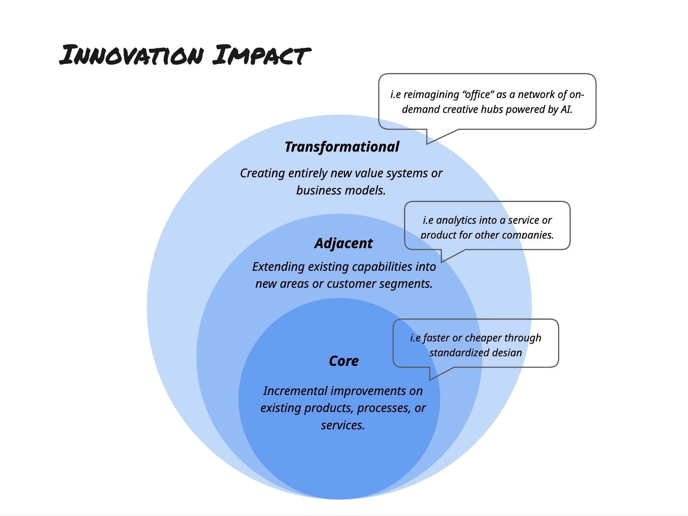 Not all change happens at the same speed or depth. In our work, we map it into three layers: core, adjacent, and transformational.