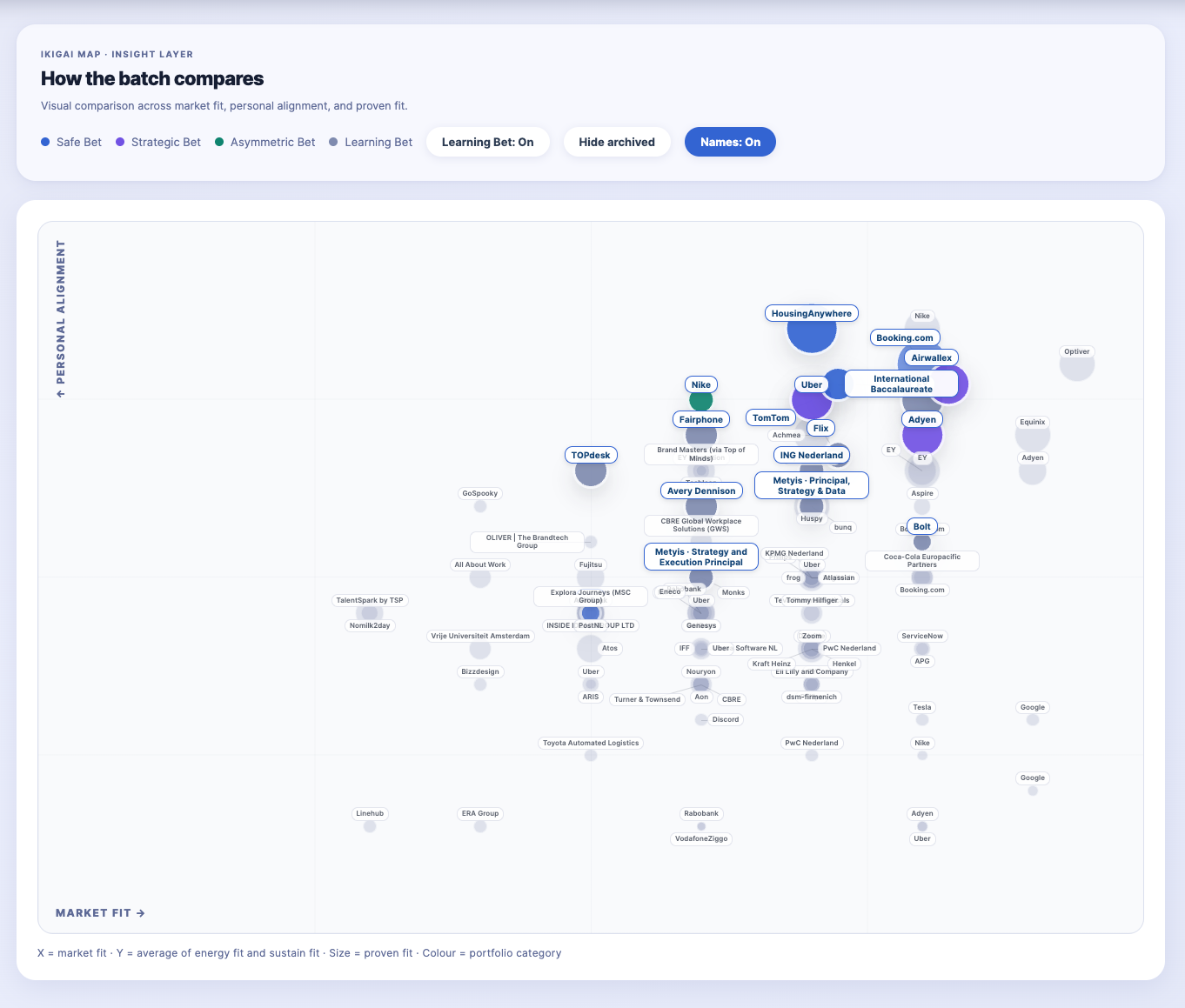 Every role gets a colour on the map, a portfolio category that describes the nature of the move.